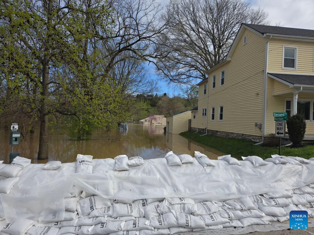 Photo taken on April 7, 2025 shows sandbags piled around a waterlogged area in Frankfort, Kentucky, the United States. (Photo by Wang Changzheng/Xinhua)