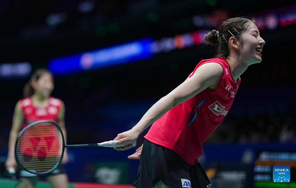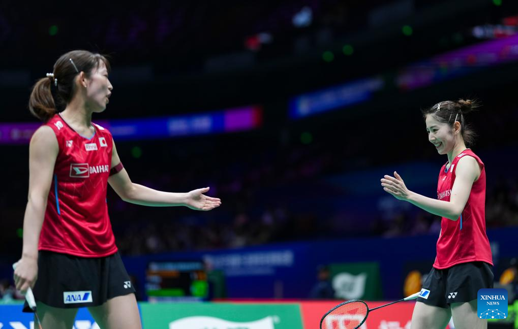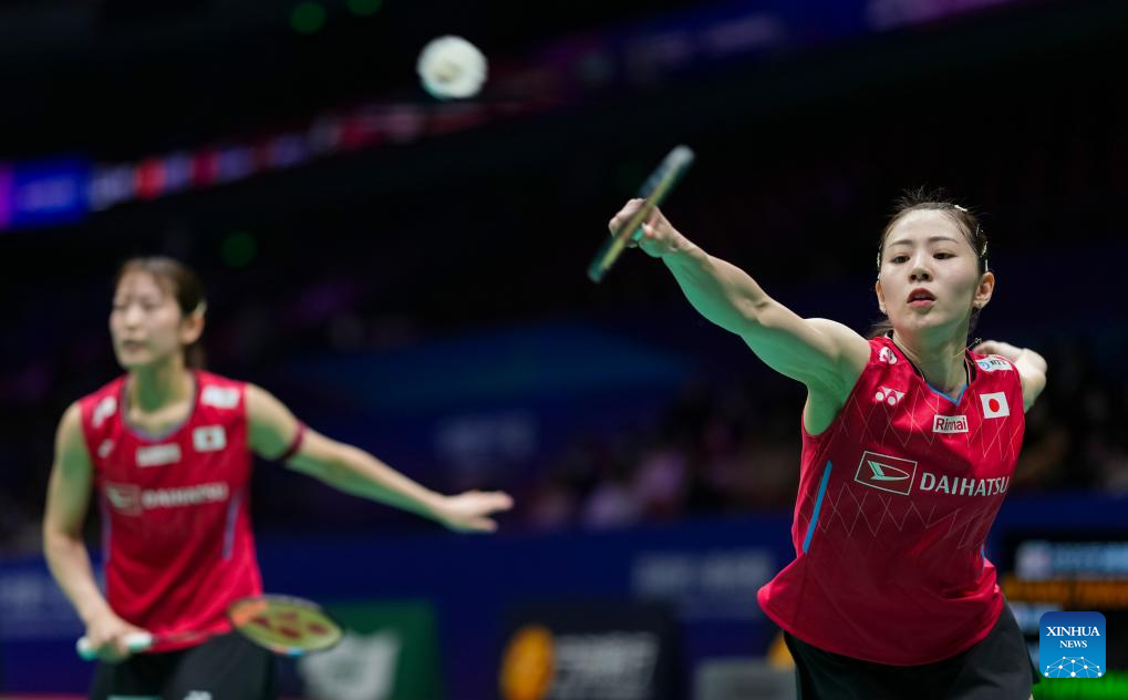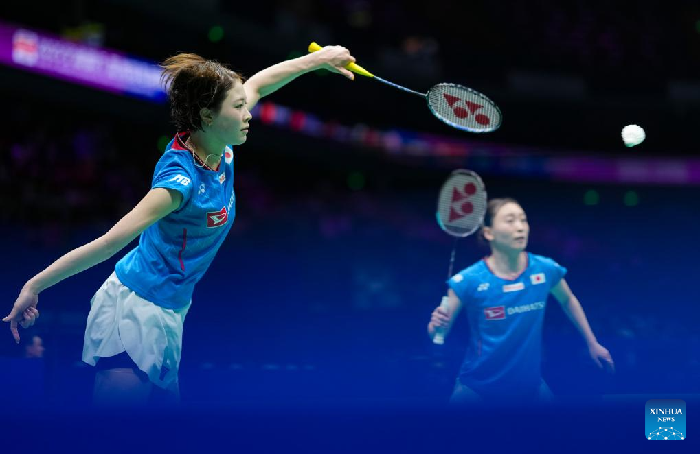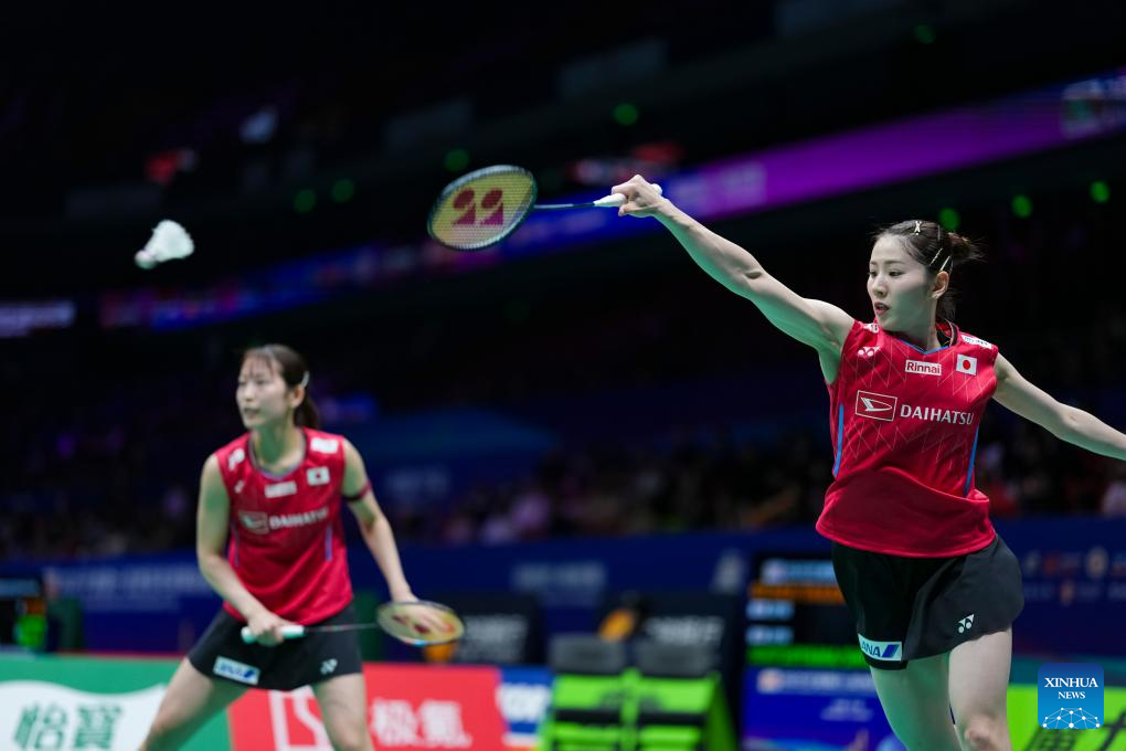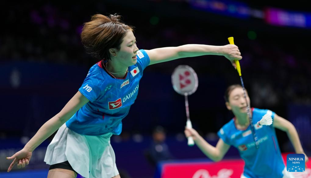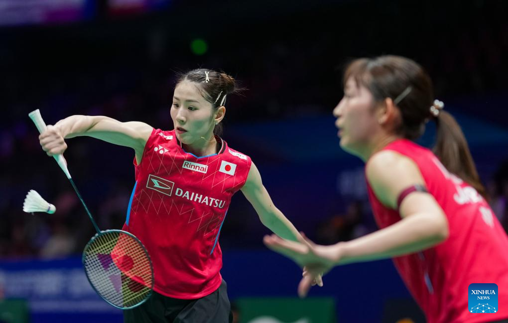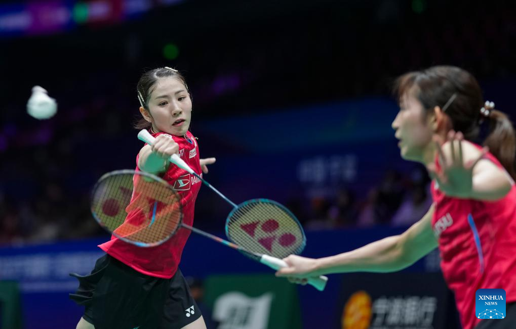 Matsuyama Nami/Shida Chiharu (L) of Japan compete during the women's doubles round of 32 match against Otake Mizuki/Takahashi Miyu of Japan at Badminton Asia Championships 2025 in Ningbo, east China's Zhejiang Province, April 9, 2025. (Xinhua/Sun Fei)