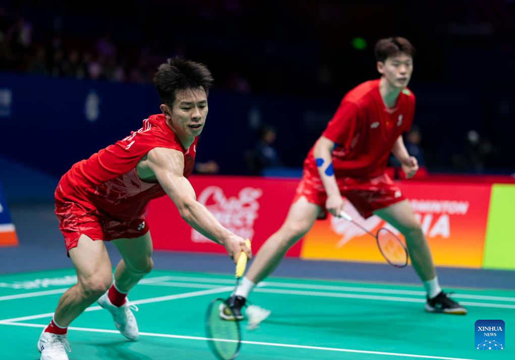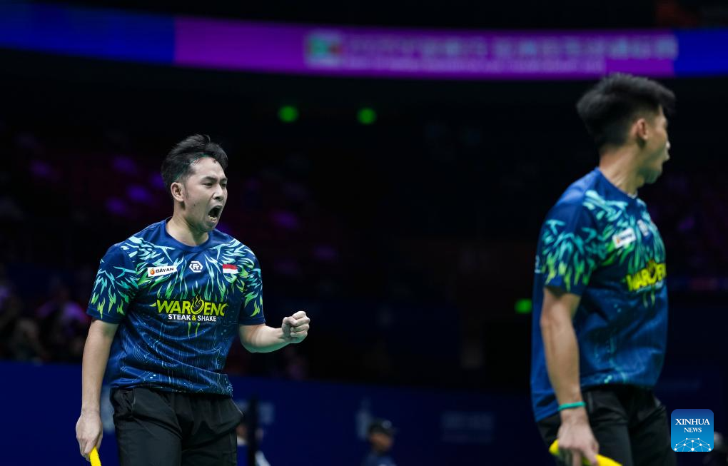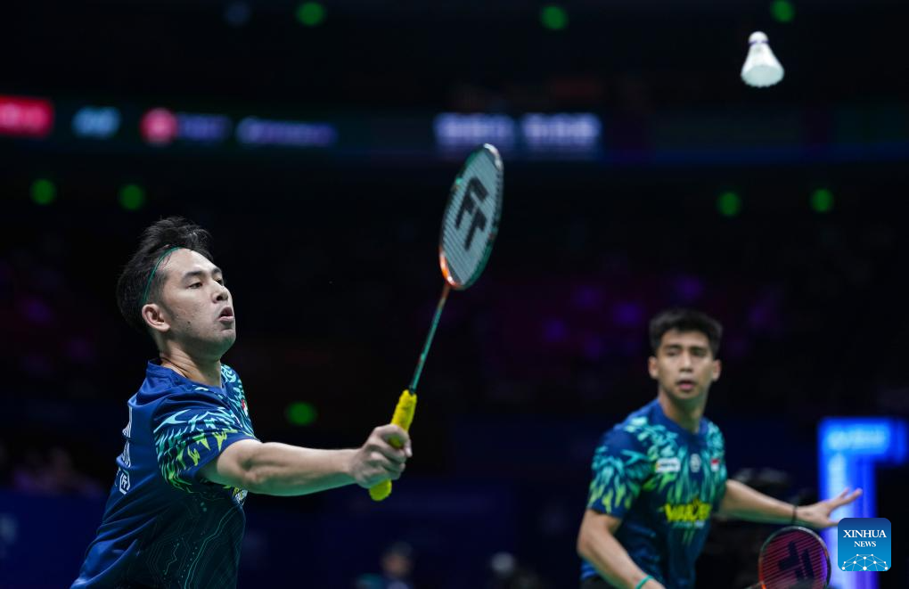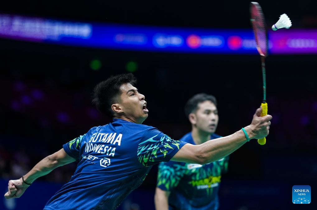 Sabar Karyaman Gutama (L)/Moh Reza Pahlevi Isfahani of Indonesia compete during the men's doubles round of 32 match against Chen Boyang/Liu Yi of China at Badminton Asia Championships 2025 in Ningbo, east China's Zhejiang Province, April 9, 2025. (Xinhua/Sun Fei)