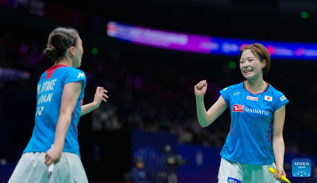 Matsuyama Nami/Shida Chiharu (R) of Japan celebrate a score during the women's doubles round of 32 match against Otake Mizuki/Takahashi Miyu of Japan at Badminton Asia Championships 2025 in Ningbo, east China's Zhejiang Province, April 9, 2025. (Xinhua/Sun Fei)