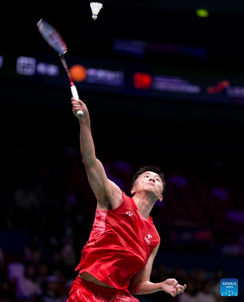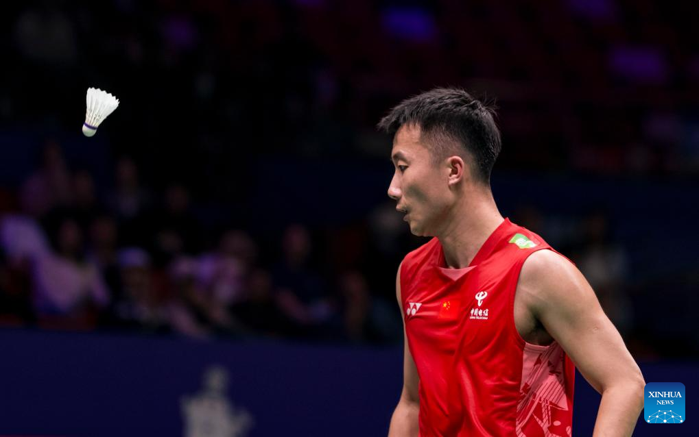 Lu Guangzu of China competes during the men's singles round of 32 match against Haseena Sunil Prannoy of India at Badminton Asia Championships 2025 in Ningbo, east China's Zhejiang Province, April 9, 2025. (Xinhua/Sun Fei)