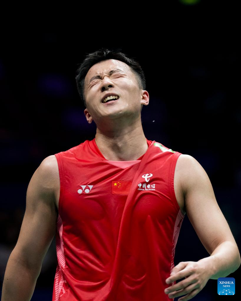 Lu Guangzu of China reacts during the men's singles round of 32 match against Haseena Sunil Prannoy of India at Badminton Asia Championships 2025 in Ningbo, east China's Zhejiang Province, April 9, 2025. (Xinhua/Sun Fei)
