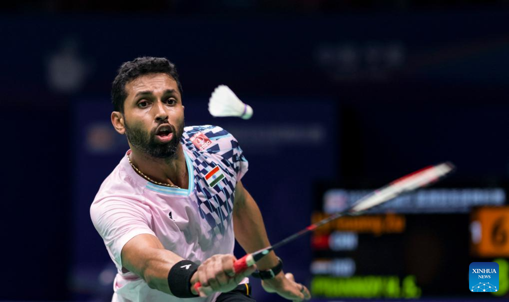 Haseena Sunil Prannoy of India hits a return during the men's singles round of 32 match against Lu Guangzu of China at Badminton Asia Championships 2025 in Ningbo, east China's Zhejiang Province, April 9, 2025. (Xinhua/Sun Fei)