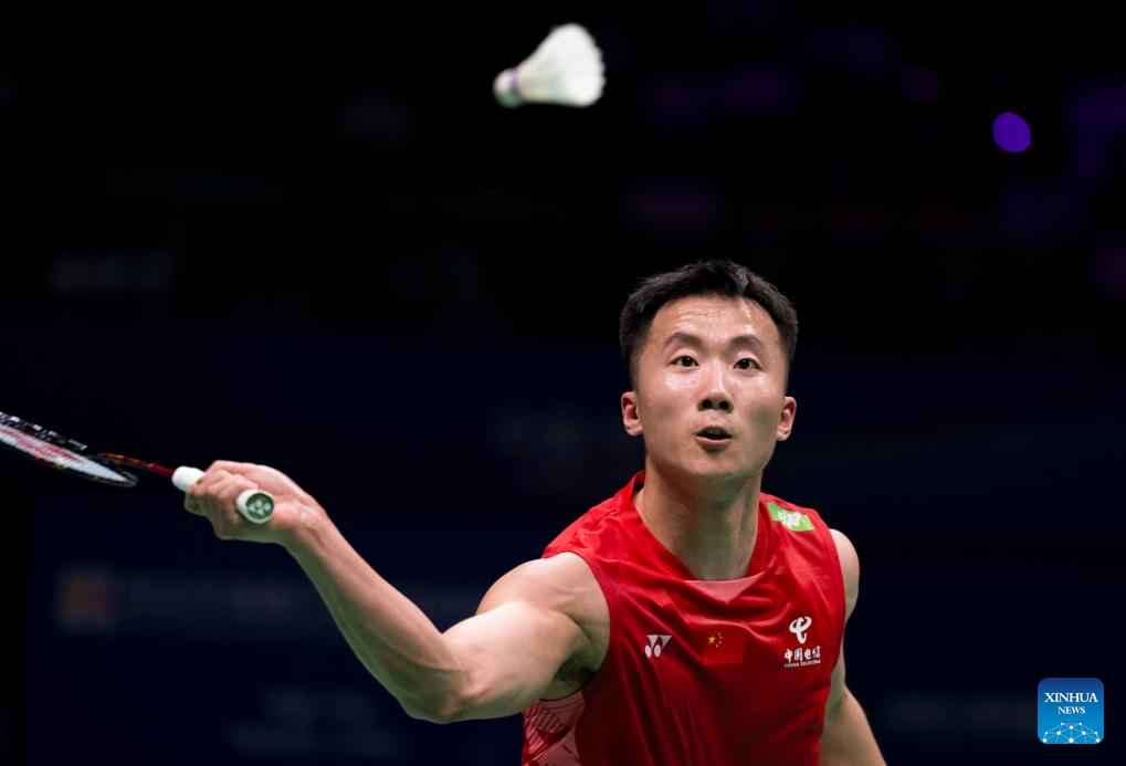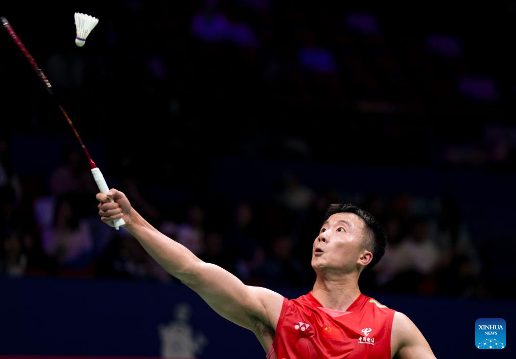 Lu Guangzu of China hits a return during the men's singles round of 32 match against Haseena Sunil Prannoy of India at Badminton Asia Championships 2025 in Ningbo, east China's Zhejiang Province, April 9, 2025. (Xinhua/Sun Fei)