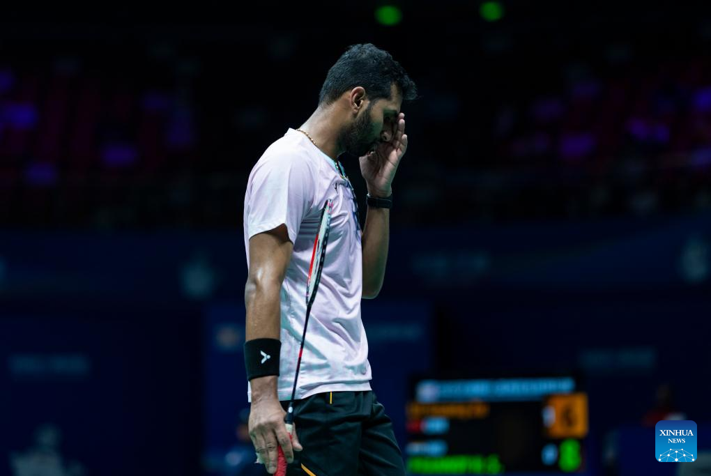 Haseena Sunil Prannoy of India reacts during the men's singles round of 32 match against Lu Guangzu of China at Badminton Asia Championships 2025 in Ningbo, east China's Zhejiang Province, April 9, 2025. (Xinhua/Sun Fei)