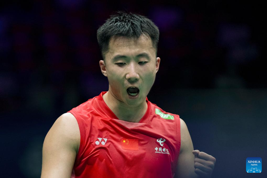 Lu Guangzu of China celebrates a score during the men's singles round of 32 match against Haseena Sunil Prannoy of India at Badminton Asia Championships 2025 in Ningbo, east China's Zhejiang Province, April 9, 2025. (Xinhua/Sun Fei)