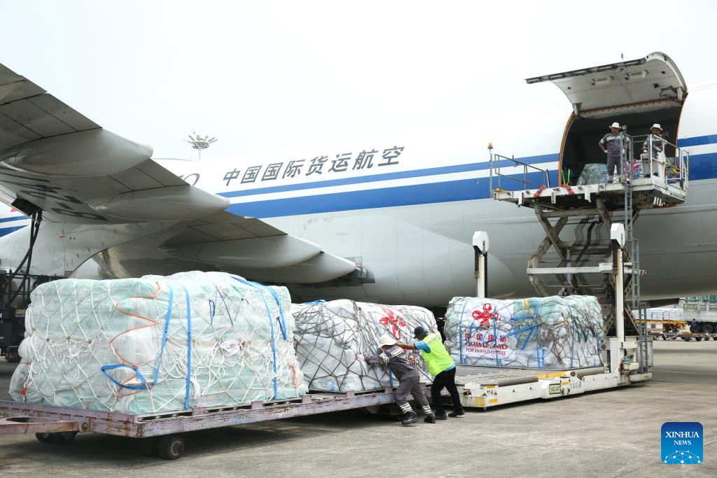 The fifth batch of emergency humanitarian aid supplies dispatched by the Chinese government arrives at Yangon International Airport in Myanmar on April 9, 2025. The aid supplies include 266 tents, 20,000 mosquito nets, 9,000 tarpaulins, and 2,000 boxes of instant noodles, with a total weight of over 91 tons. (Xinhua/Myo Kyaw Soe)