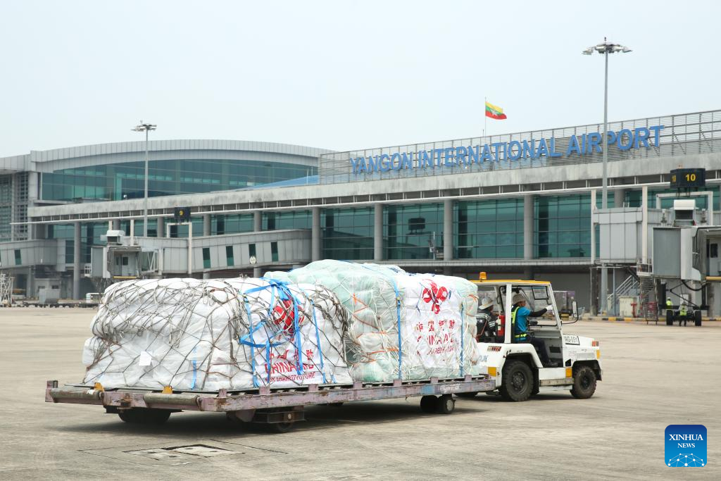 YANGON, April 9 (Xinhua) -- The fifth batch of emergency humanitarian aid supplies dispatched by the Chinese government arrived at Yangon International Airport in Myanmar on Wednesday.