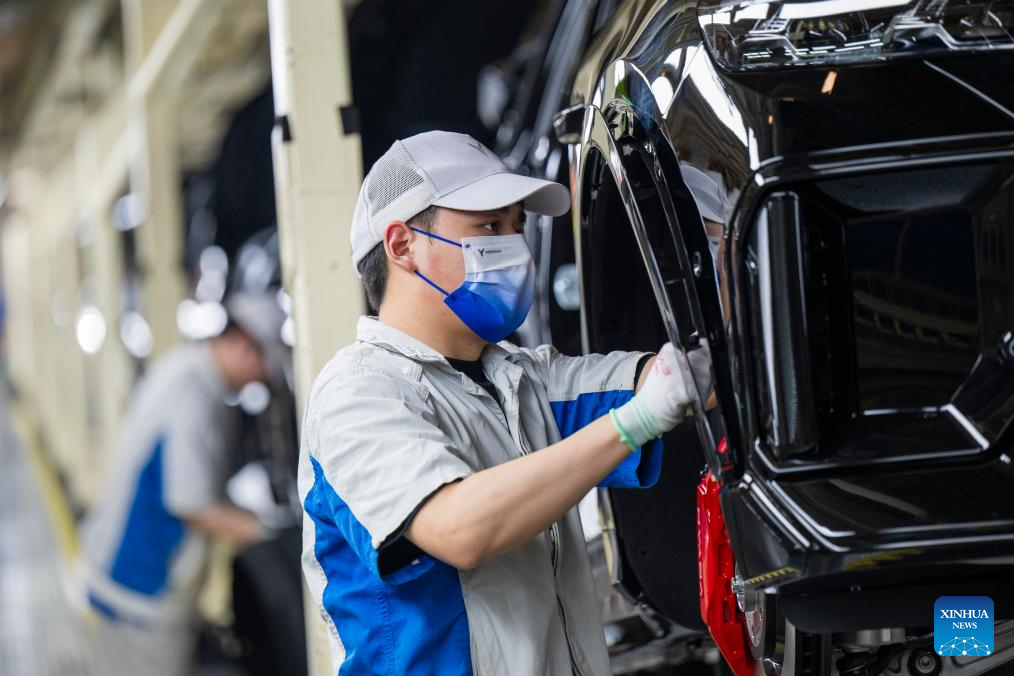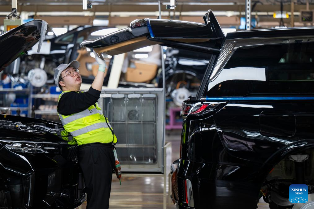 A worker works at an assembly line of Voyah, a Chinese NEV brand, in Wuhan, central China's Hubei Province, April 9, 2025. The 200,000th vehicle of Voyah rolled off the assembly line in Wuhan on Wednesday. (Xinhua/Wu Zhizun)