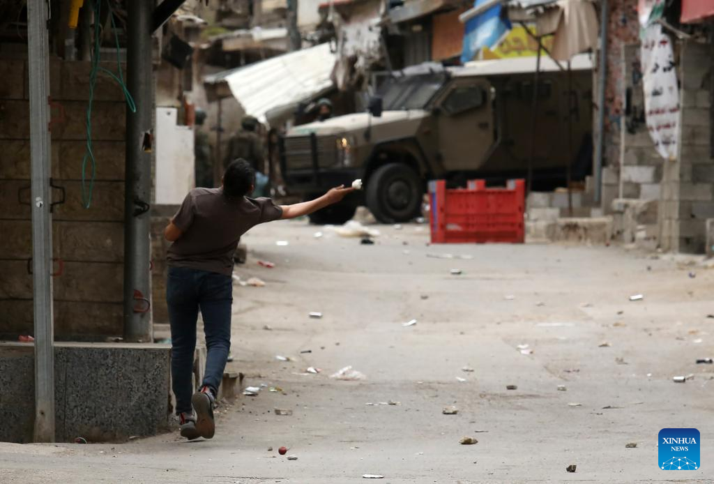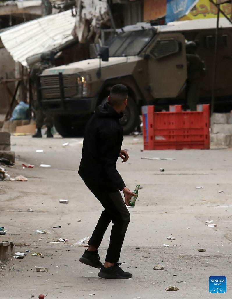 A Palestinian hurls a bottle at Israeli forces during clashes in the Balata refugee camp, east of Nablus in the northern West Bank, on April 9, 2025. Israeli security forces arrested a senior militant in Nablus, according to a joint statement issued by the Israel Defense Forces (IDF), the Israel Security Agency (ISA) and the Israel Police on Wednesday. (Photo by Nidal Eshtayeh/Xinhua)