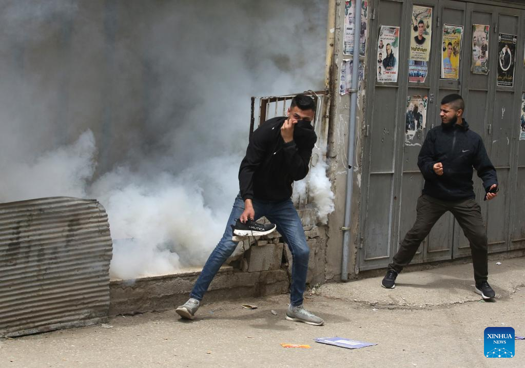 Palestinians run to take cover from tear gas canisters fired by Israeli forces during clashes in the Balata refugee camp, east of Nablus in the northern West Bank, on April 9, 2025. Israeli security forces arrested a senior militant in Nablus, according to a joint statement issued by the Israel Defense Forces (IDF), the Israel Security Agency (ISA) and the Israel Police on Wednesday. (Photo by Nidal Eshtayeh/Xinhua)