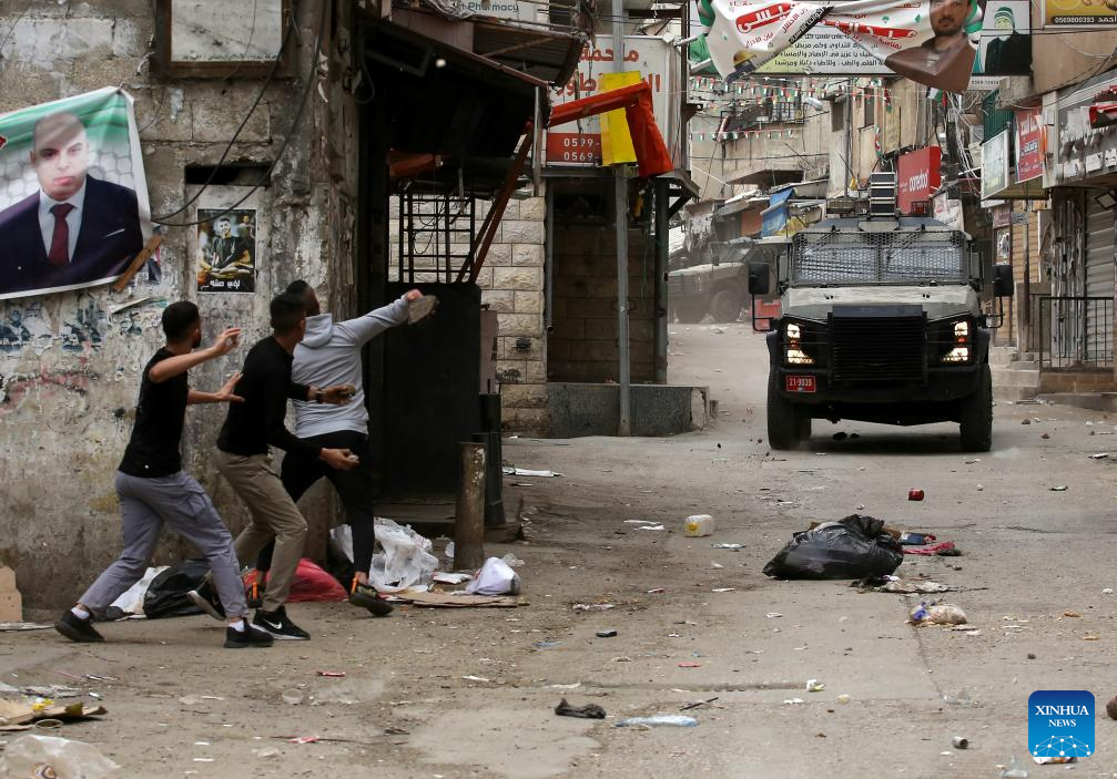 Palestinians confront Israeli forces during clashes in the Balata refugee camp, east of Nablus in the northern West Bank, on April 9, 2025. Israeli security forces arrested a senior militant in Nablus, according to a joint statement issued by the Israel Defense Forces (IDF), the Israel Security Agency (ISA) and the Israel Police on Wednesday. (Photo by Nidal Eshtayeh/Xinhua)