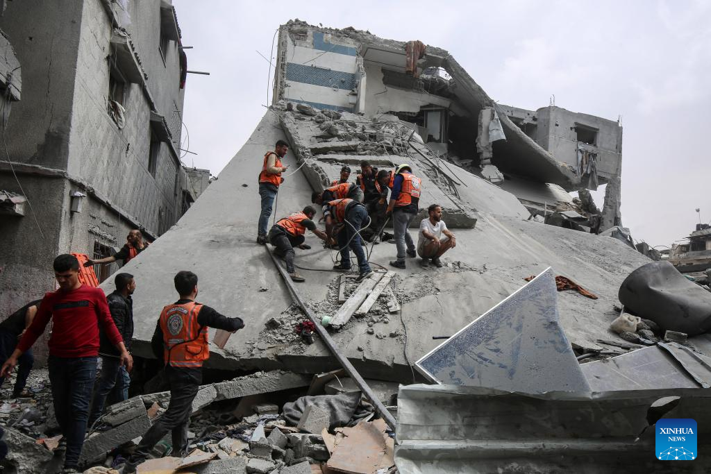 Rescuers search for survivors among the rubble of destroyed buildings in the Shuja'iyya neighborhood, east of Gaza City, on April 9, 2025. At least 29 Palestinians were killed and more than 50 others injured on Wednesday in an Israeli airstrike that hit a residential block in the Shuja'iyya neighborhood, Hamas said in a statement. (Photo by Rizek Abdeljawad/Xinhua)