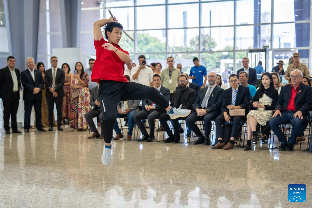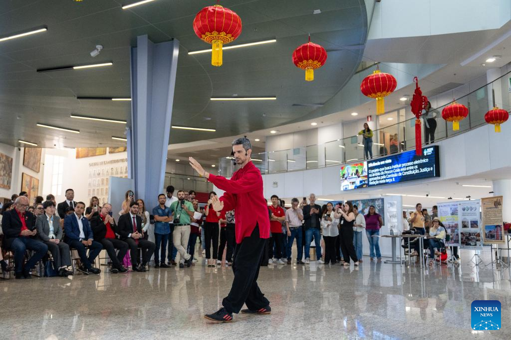 A Chinese culture enthusiast performs Tai Chi during a Chinese cultural event in Goiania, the state of Goias, Brazil, April 9, 2025. An event featuring traditional Chinese culture opened at the Legislative Assembly of Goias State on Wednesday, attracting many local visitors. (Xinhua/Wang Tiancong)