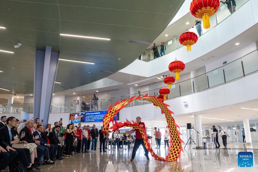 A teacher from the Confucius Institute of Chinese Medicine at the Federal University of Goias performs a dragon fitness dance during a Chinese cultural event in Goiania, the state of Goias, Brazil, April 9, 2025. An event featuring traditional Chinese culture opened at the Legislative Assembly of Goias State on Wednesday, attracting many local visitors. (Xinhua/Wang Tiancong)