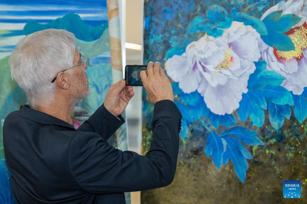 A visitor takes photos of a piece of Chinese painting during a Chinese cultural event in Goiania, the state of Goias, Brazil, April 9, 2025. An event featuring traditional Chinese culture opened at the Legislative Assembly of Goias State on Wednesday, attracting many local visitors. (Xinhua/Wang Tiancong)