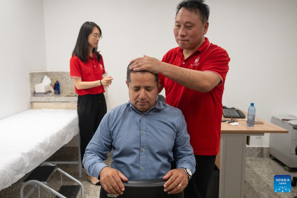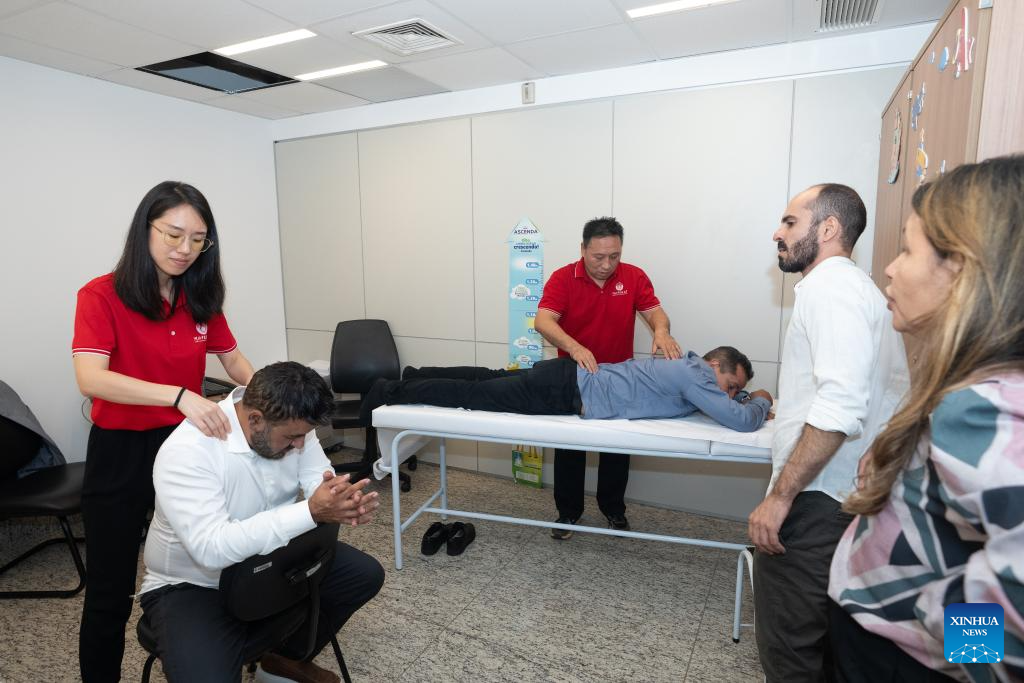 Teachers from the Confucius Institute of Chinese Medicine at the Federal University of Goias performs Tui Na therapy on participants during a Chinese cultural event in Goiania, the state of Goias, Brazil, April 9, 2025. An event featuring traditional Chinese culture opened at the Legislative Assembly of Goias State on Wednesday, attracting many local visitors. (Xinhua/Wang Tiancong)