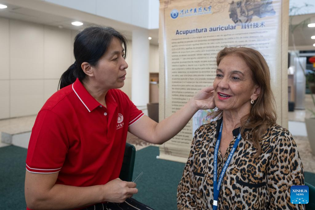A teacher (L) from the Confucius Institute of Chinese Medicine at the Federal University of Goias administers auricular therapy to a participant during a Chinese cultural event in Goiania, the state of Goias, Brazil, April 9, 2025. An event featuring traditional Chinese culture opened at the Legislative Assembly of Goias State on Wednesday, attracting many local visitors. (Xinhua/Wang Tiancong)