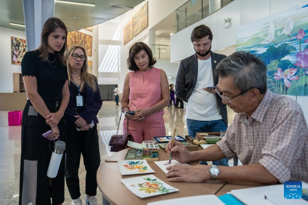 Audience watch an artist (1st R) creating a painting during a Chinese cultural event in Goiania, the state of Goias, Brazil, April 9, 2025. An event featuring traditional Chinese culture opened at the Legislative Assembly of Goias State on Wednesday, attracting many local visitors. (Xinhua/Wang Tiancong)