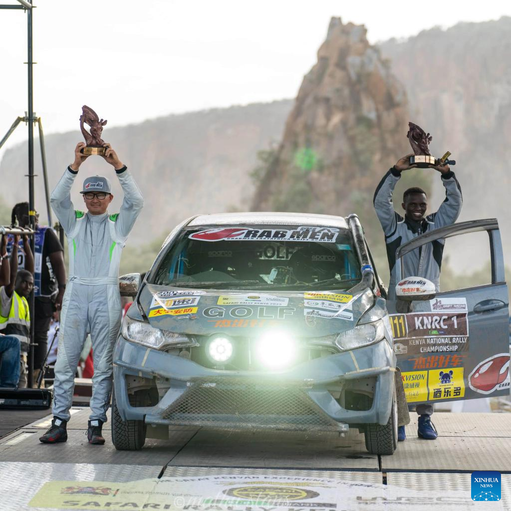 Lu Jin (L) and his navigator Michael Kirui pose for photos, both holding finisher trophies, at the finishing line after the ARC/KNRC race at the Kenya Safari Rally, the third stop of the 2025 FIA World Rally Championship, in Naivasha, Kenya, March 23, 2025. (Xinhua)