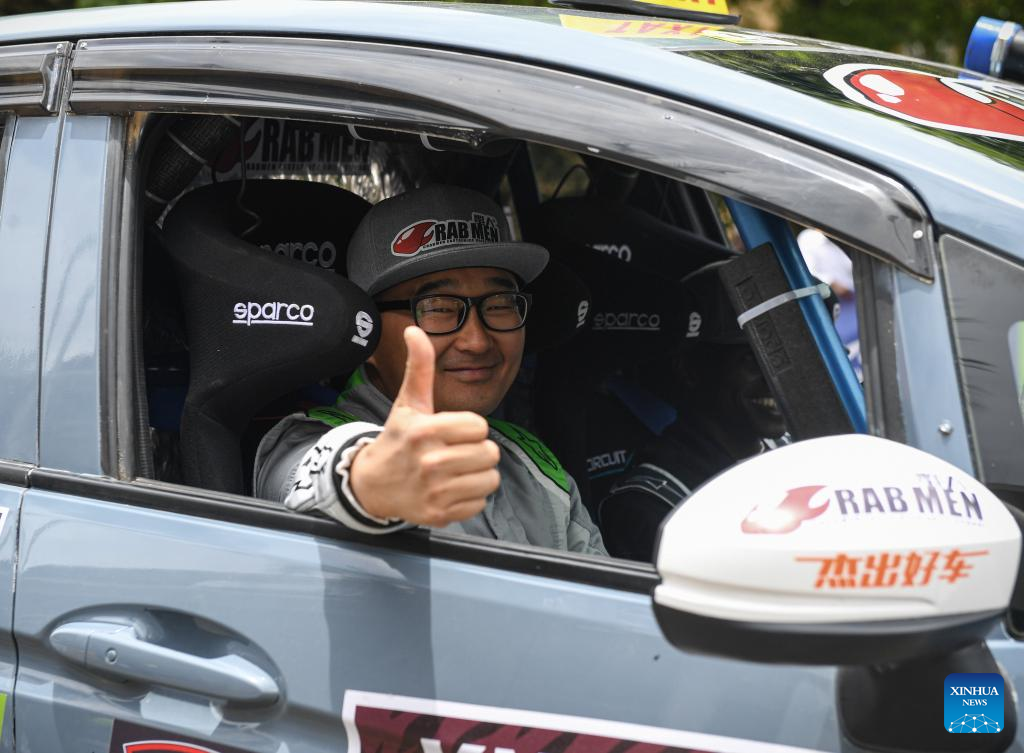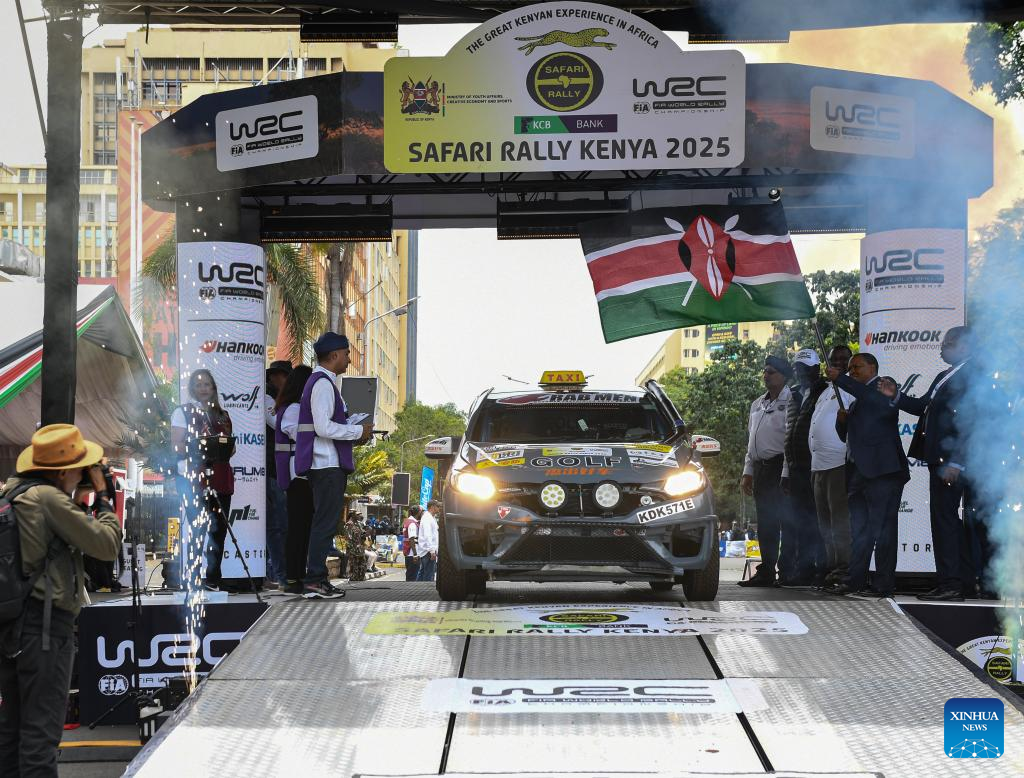 Lu Jin's vehicle sets off at the starting point during the ARC/KNRC race at the Kenya Safari Rally, the third stop of the 2025 FIA World Rally Championship, in Nairobi, Kenya, March 20, 2025. (Xinhua/Li Yahui)