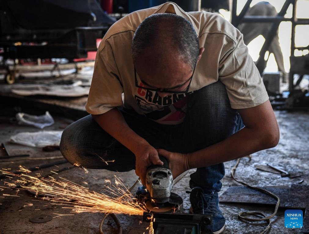 Lu Jin cuts vehicle parts in a workshop in Mogotio, Kenya, March 6, 2025. (Xinhua/Li Yahui)