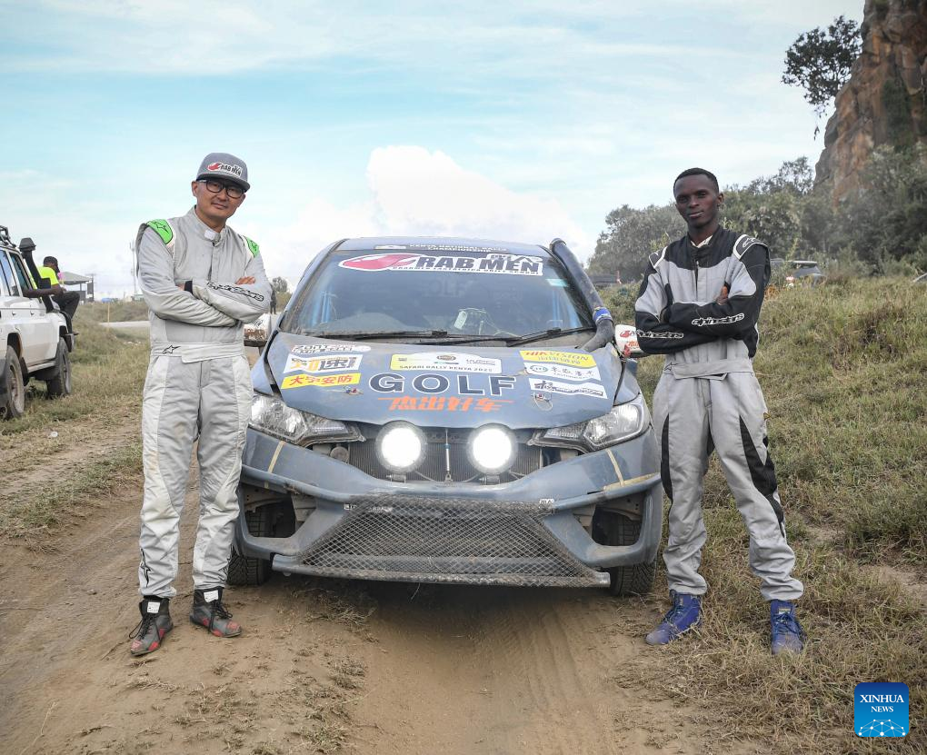 Lu Jin (L) poses for a photo with his navigator Michael Kirui after the ARC/KNRC race at the Kenya Safari Rally, the third stop of the 2025 FIA World Rally Championship, in Naivasha, Kenya, March 23, 2025. (Xinhua/Li Yahui)