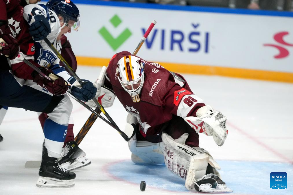 Latvia's goalkeeper Gustavs Grigals (R) tries to make a save during an ice hockey exhibition game between Latvia and Finland at the Xiaomi Arena in Riga, Latvia, April 9, 2025. (Photo by Edijs Palens/Xinhua)