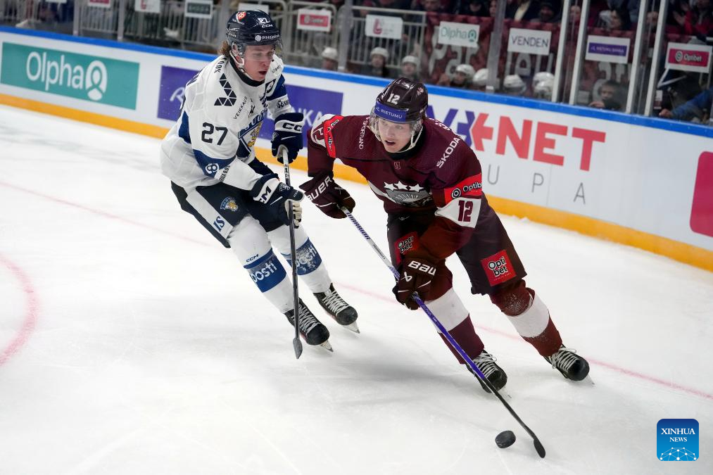 Latvia's Martins Lavins (R) battles for the puck during an ice hockey exhibition game between Latvia and Finland at the Xiaomi Arena in Riga, Latvia, April 9, 2025. (Photo by Edijs Palens/Xinhua)