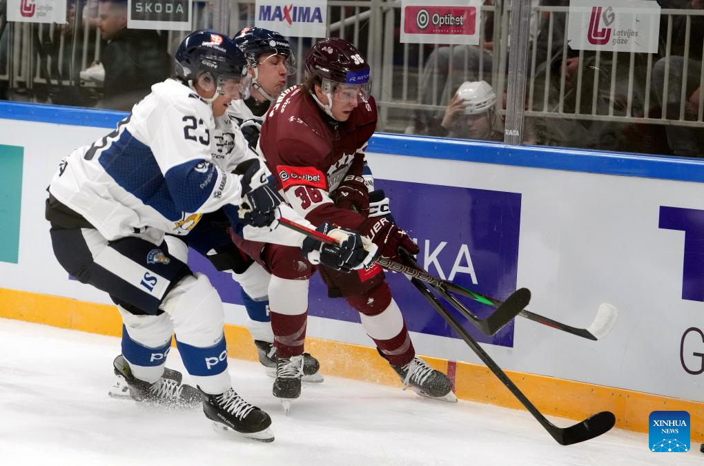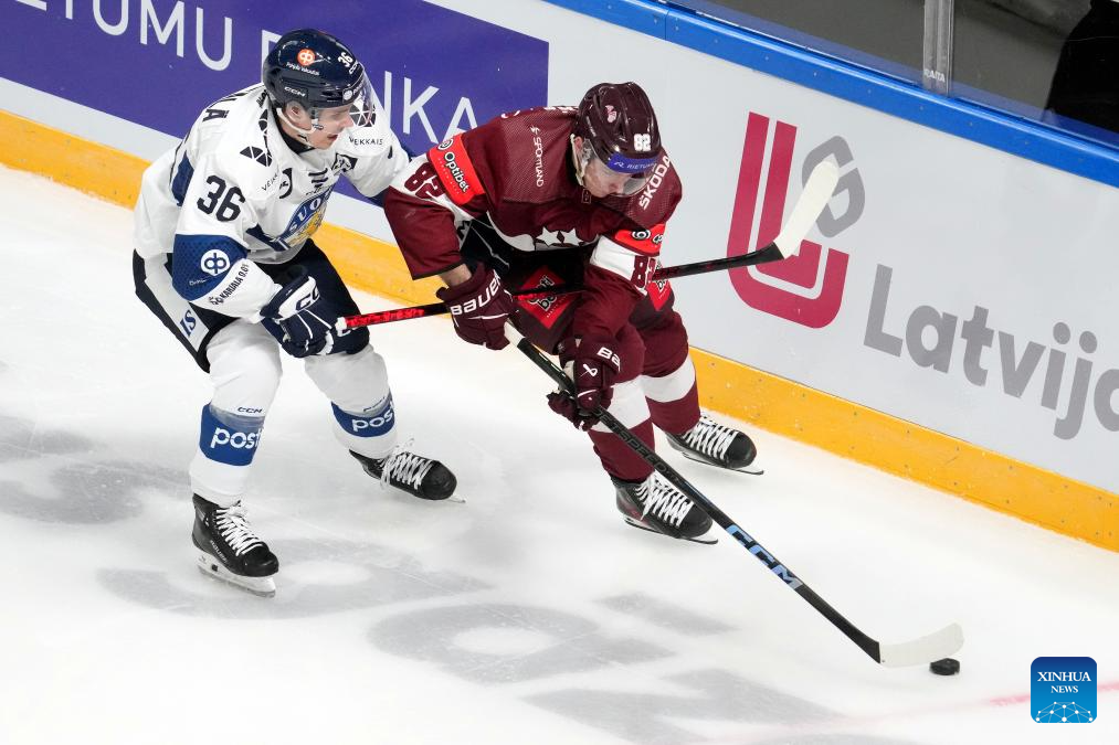 Latvia's Felikss Gavars (R) vies with Finland's Peetro Seppala during an ice hockey exhibition game between Latvia and Finland at the Xiaomi Arena in Riga, Latvia, April 9, 2025. (Photo by Edijs Palens/Xinhua)