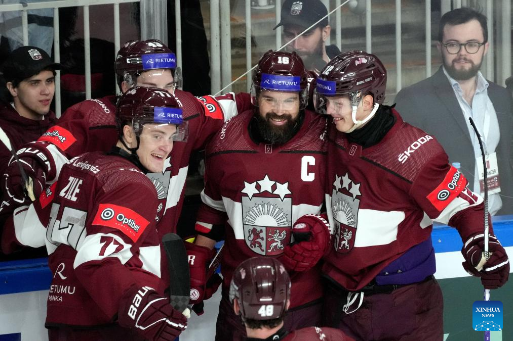 Latvia's players celebrate a goal during an ice hockey exhibition game between Latvia and Finland at the Xiaomi Arena in Riga, Latvia, April 9, 2025. (Photo by Edijs Palens/Xinhua)
