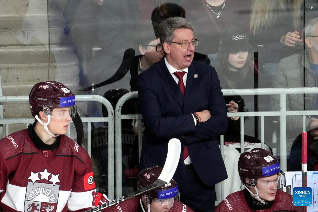 Latvia's head coach Harijs Vitolins (R top) instructs players during an ice hockey exhibition game between Latvia and Finland at the Xiaomi Arena in Riga, Latvia, April 9, 2025. (Photo by Edijs Palens/Xinhua)