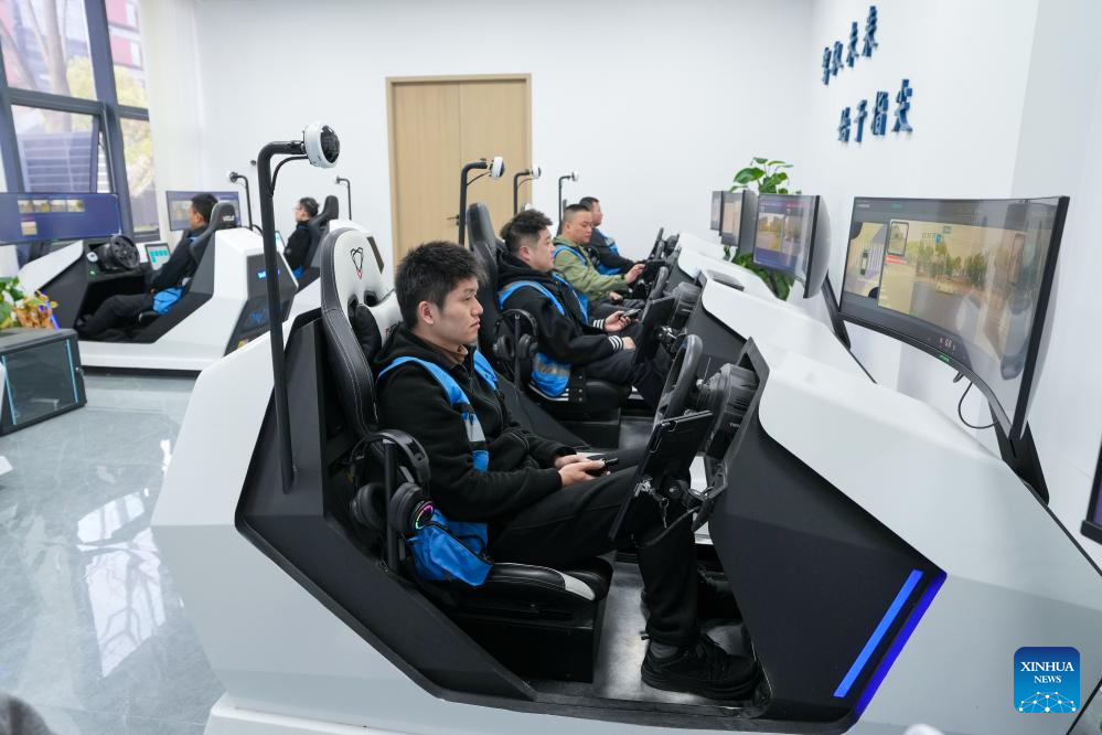 Security staff monitor the operation of self-driving minibuses at a smart driving service center in Wuxi, east China's Jiangsu Province, March 31, 2025. (Xinhua/Li Bo)