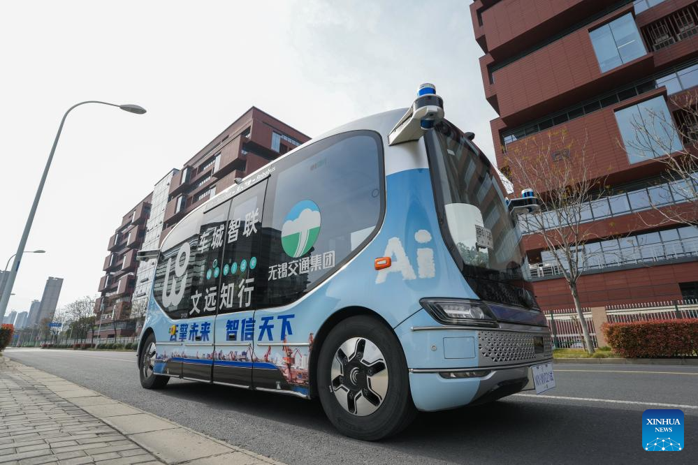 A minibus runs on a road in an eco-industrial park of intelligent connected vehicles in Wuxi, east China's Jiangsu Province, March 31, 2025. (Xinhua/Li Bo)