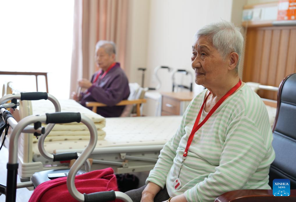 Elderly women rest in a room wearing smart name badges at a nursing home in Binghu District of Wuxi, east China's Jiangsu Province, April 8, 2025. The smart name badges can be positioned by staff members to prevent the elderly from getting lost. (Xinhua/Liu Wenhui)