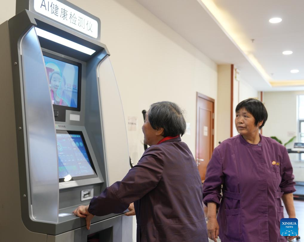 An elderly woman (L) tries an AI health detecting device with the assistance of a staff member at a nursing home in Binghu District of Wuxi, east China's Jiangsu Province, April 8, 2025. The detector will collect and send the health data to the nurse station, allowing an in-time adaptation of the nursing plans in accordance to the health status of the elderly. (Xinhua/Liu Wenhui)