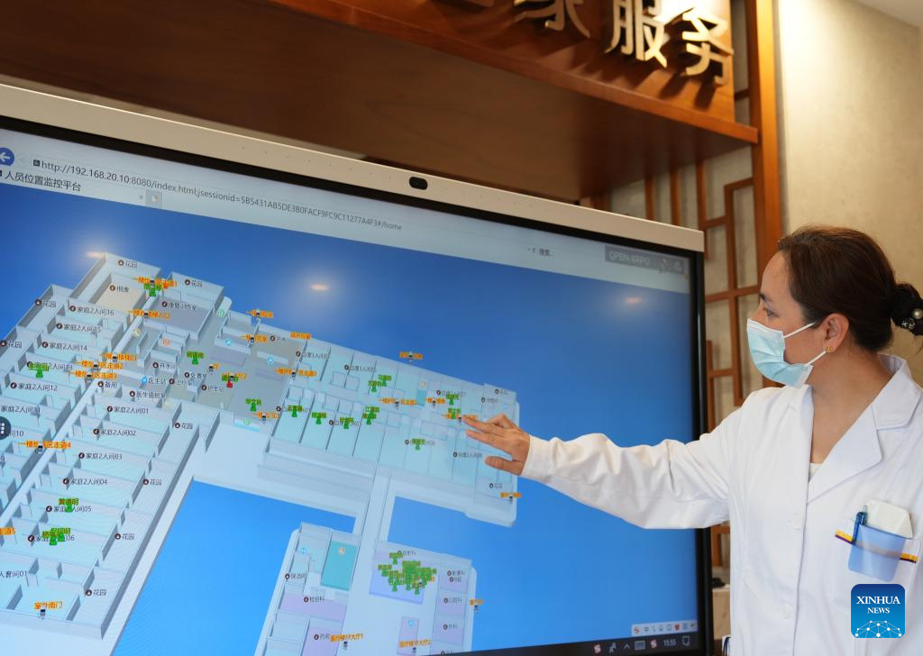 A staff member locates the particular positions of the elderly with a monitoring platform at a nursing home in Binghu District of Wuxi, east China's Jiangsu Province, April 8, 2025. In recent years, Jiangsu Province has actively promoted the high-quality development of the Internet of Things, striving to build up an industrial innovation center with global influence.