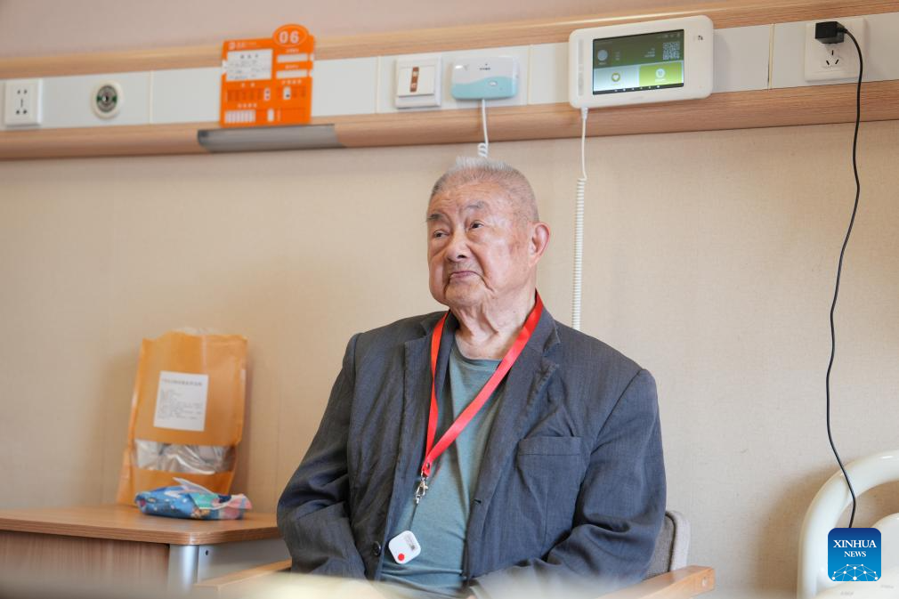 An elderly man rests in his room at a nursing home in Binghu District of Wuxi, east China's Jiangsu Province, April 8, 2025. The smart health monitoring device behind him can transmit his real-time respiration and heartbeat conditions to the nurse station. (Xinhua/Liu Wenhui)