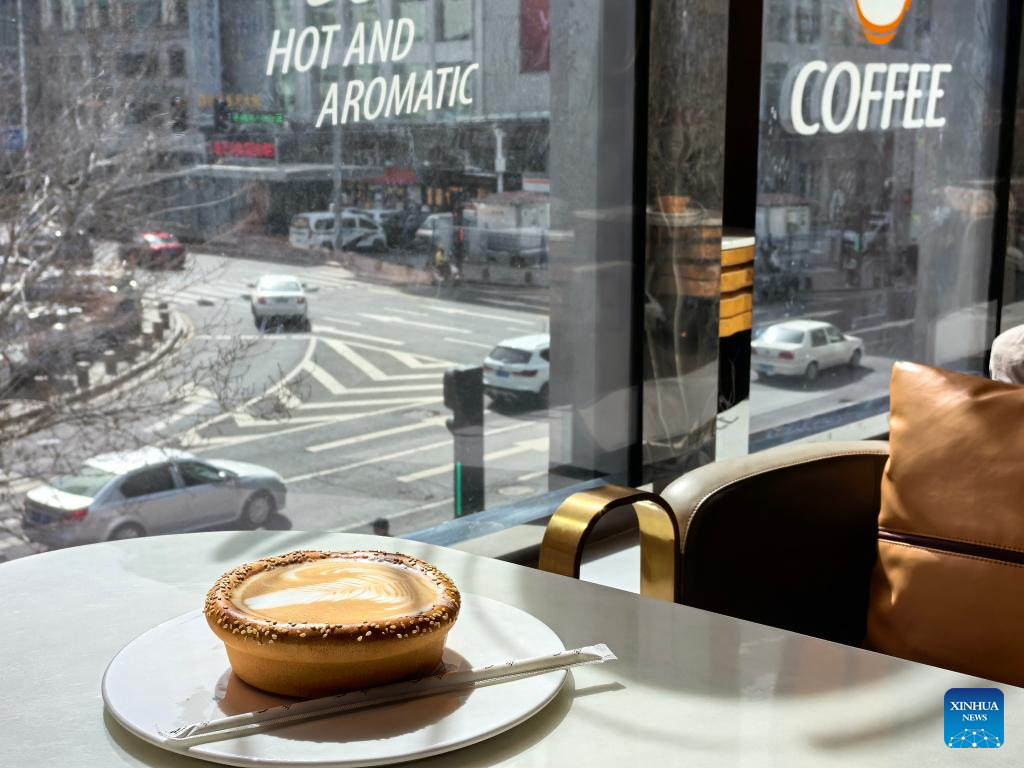 A product combined with latte and nang, a local flatbread, is pictured in a cafe in Urumqi, northwest China's Xinjiang Uygur Autonomous Region, March 28, 2025. From desert cafes to mountain-view lattes, China's northwest is driving a coffee transformation, blending local flavors with scenic charm to fuel a thriving "coffee+" economy. (Xinhua/He Xiaotong)
