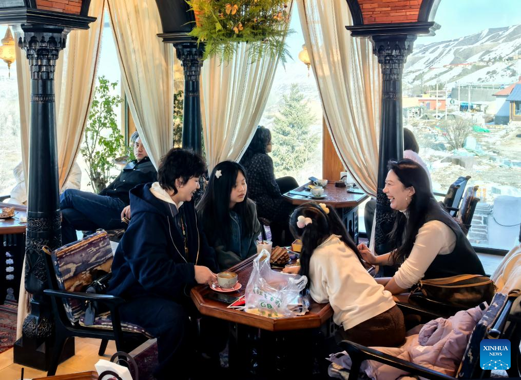 Customers enjoy coffee and their leisure time at a cafe in Baiyanggou Village in Urumqi County, northwest China's Xinjiang Uygur Autonomous Region, March 15, 2025. From desert cafes to mountain-view lattes, China's northwest is driving a coffee transformation, blending local flavors with scenic charm to fuel a thriving "coffee+" economy. (Xinhua/He Xiaotong)