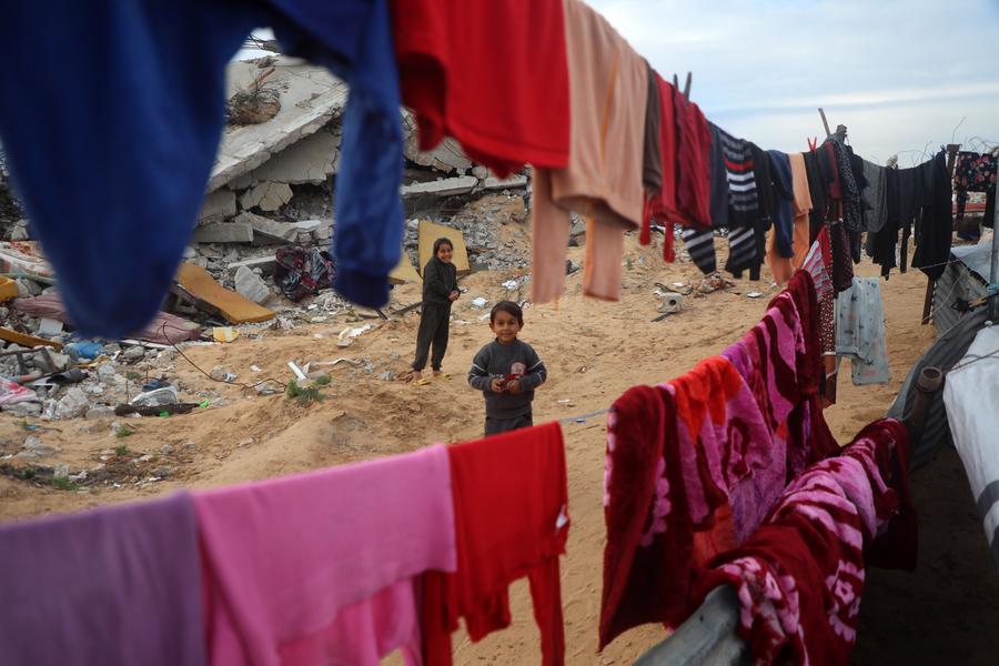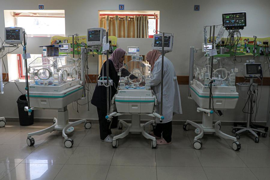 GAZA, April 11 (Xinhua) -- Inside the pediatric ward of Nasser Hospital, 35-year-old Samia Ashour sits beside her infant son, Ibrahim. He is 50 days old and weighs less than two kilograms. His limbs barely twitch. His eyes don't track movement. His mother, gaunt and grief-stricken, rocks him gently, as if willing life back into his frail body.