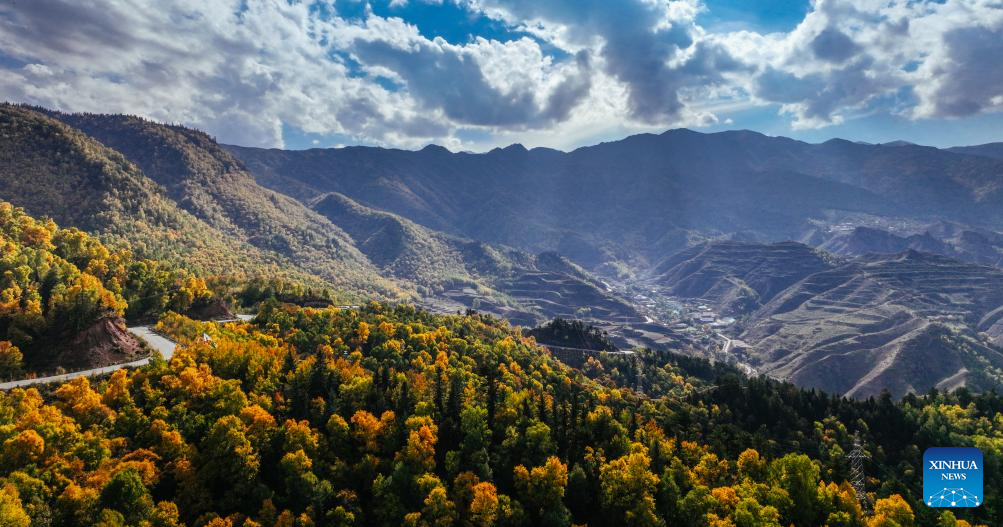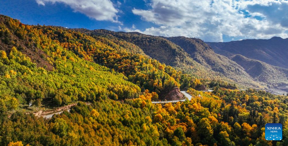An aerial drone photo taken on Oct. 9, 2023 shows a view of the Kanbula National Geopark in Huangnan Tibetan Autonomous Prefecture, northwest China's Qinghai Province. (Photo by Yangel Dongrub/Xinhua)