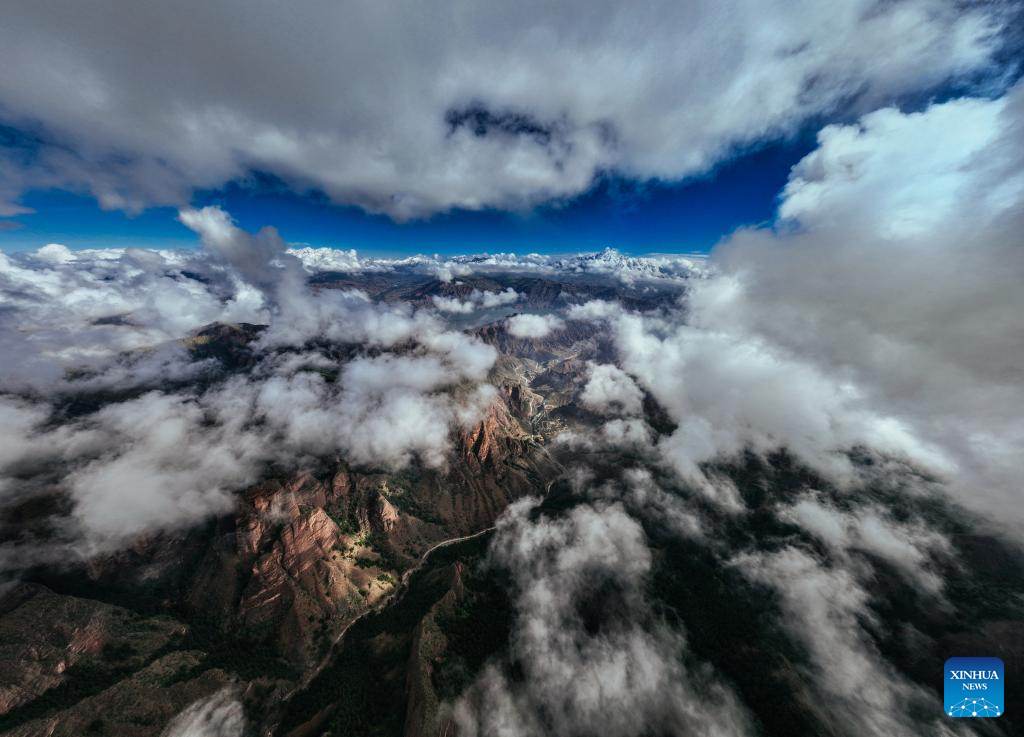 An aerial drone photo taken on June 25, 2023 shows a view of the Kanbula National Geopark in Huangnan Tibetan Autonomous Prefecture, northwest China's Qinghai Province.