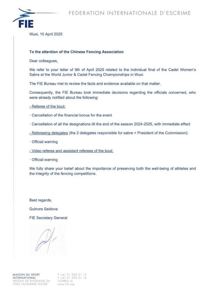 In a statement, the Chinese Fencing Association condemned the error as "devastating" for a young athlete at the outset of her career, stressing that such mistakes "severely undermine sporting fairness, damage the FIE's credibility, and harm the development of athletes and the sport itself."