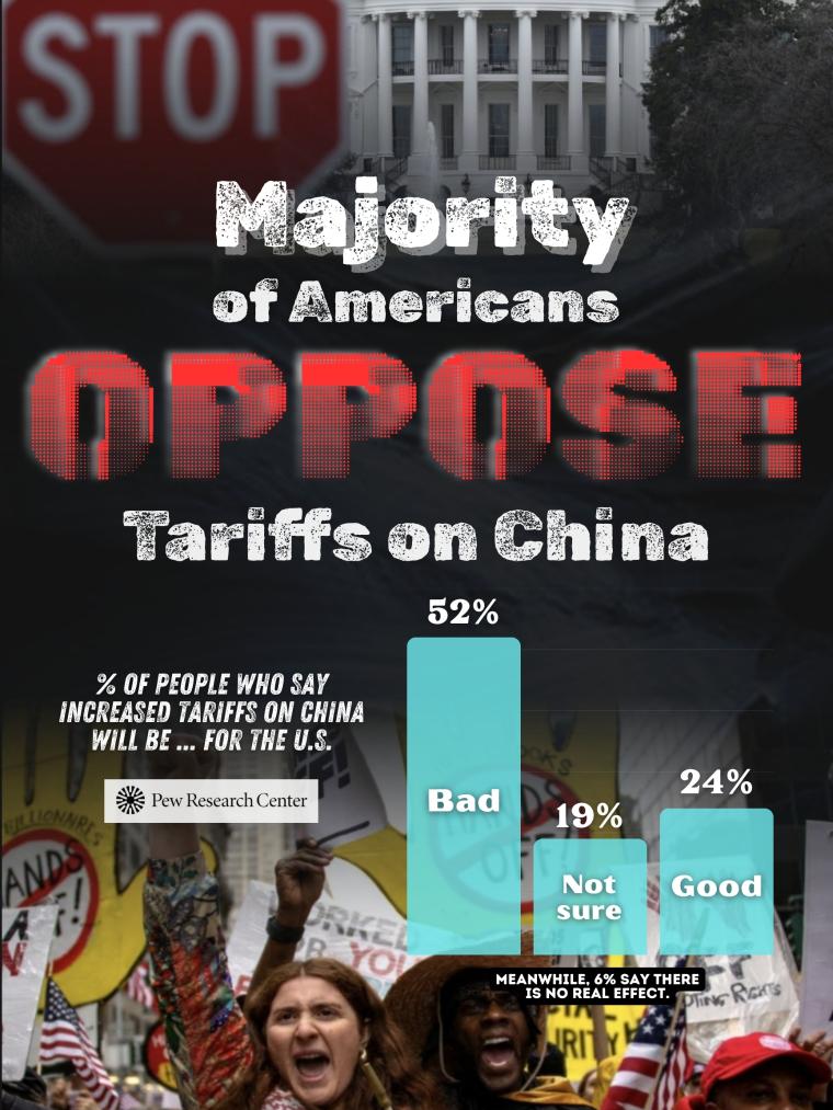 Pew Research Center: 52% of Americans believe Trump's tarrifs on Chinese products will be bad for their country; 53% think they will be bad for them personally.