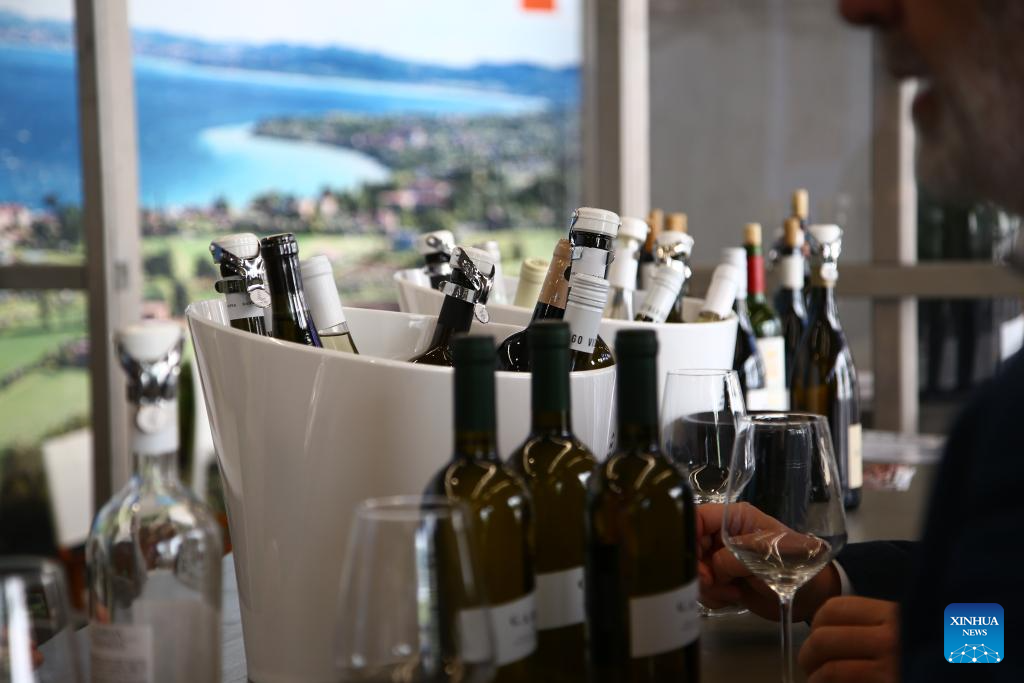 People taste wine at the international wine and spirits exhibition Vinitaly in Verona, Italy, April 9, 2025. (Xinhua)