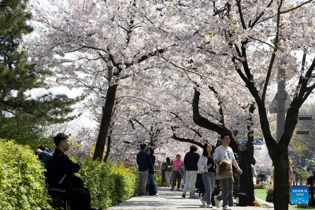 People walk under cherry blossoms at Yeouido Park in Seoul, South Korea, April 11, 2025. (Photo by Jun Hyosang/Xinhua)