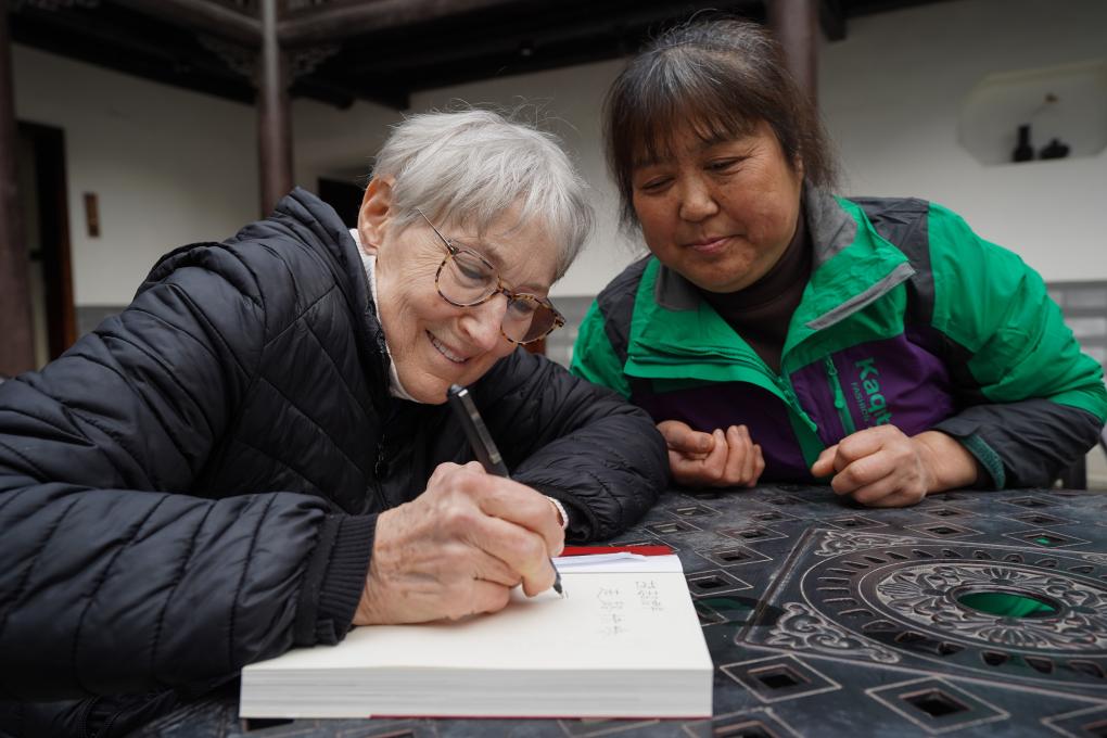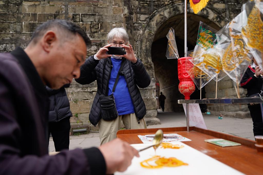 Hope Justman (L) signs her book with a note for her friend Hu Chaoqun, a restaurant owner at Zhaohua ancient town, in Guangyuan City, southwest China's Sichuan Province, March 20, 2025. (Xinhua/Xu Bingjie)Hope Justman (C) visits Zhaohua ancient town with her fellow hikers in Guangyuan City, southwest China's Sichuan Province, March 20, 2025. (Xinhua/Xu Bingjie)Hope Justman records the process of making a sugar painting at Zhaohua ancient town in Guangyuan City, southwest China's Sichuan Province, March 20, 2025. (Xinhua/Xu Bingjie)