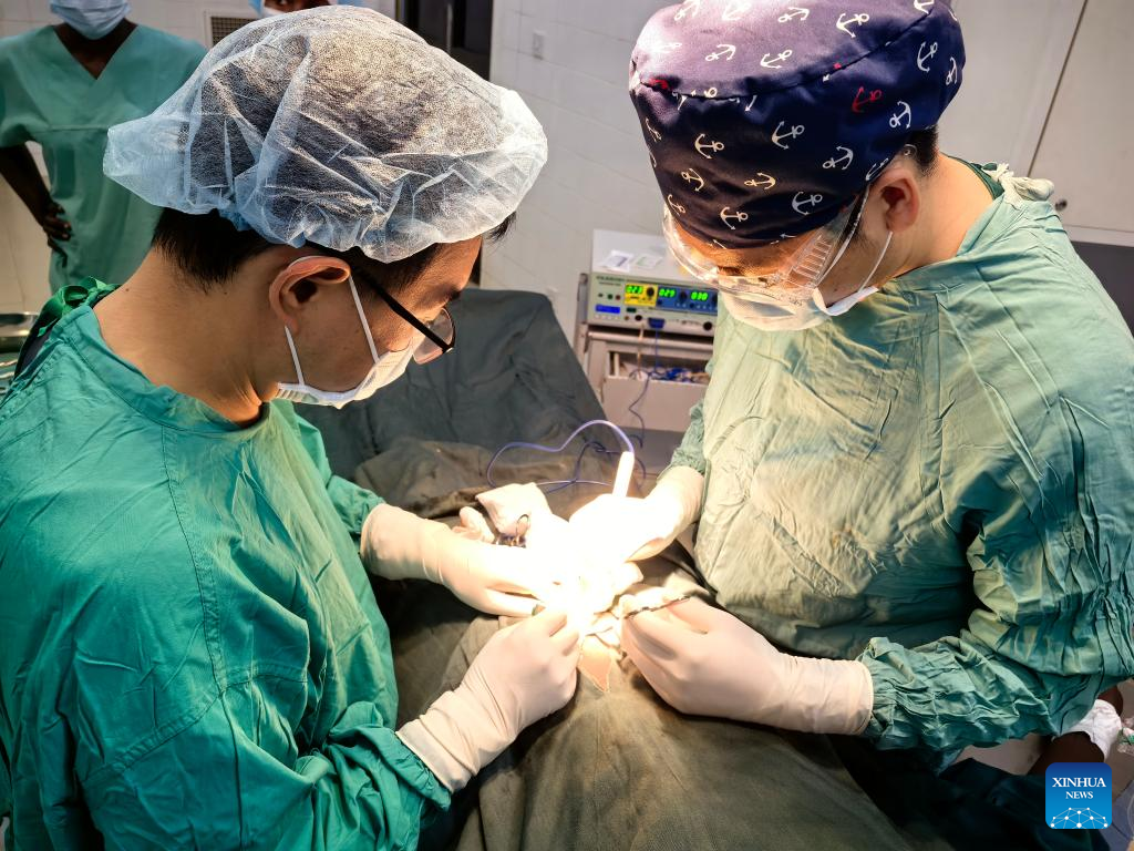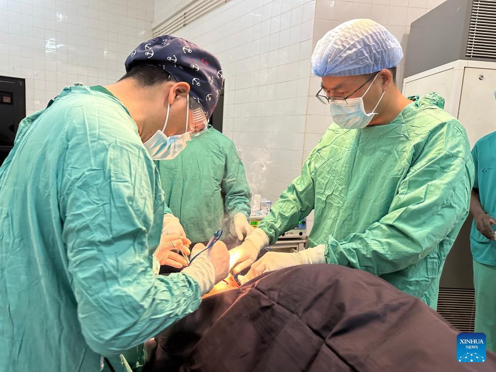 Members of the 22nd batch of the Chinese medical team in The Gambia perform a surgery for a patient at the Farafenni General Hospital in the North Bank Division, The Gambia, April 10, 2025. The 22nd batch of the Chinese medical team in The Gambia conducted an outreach clinic and medical supplies donation event at the Farafenni General Hospital in the North Bank Division on Friday.