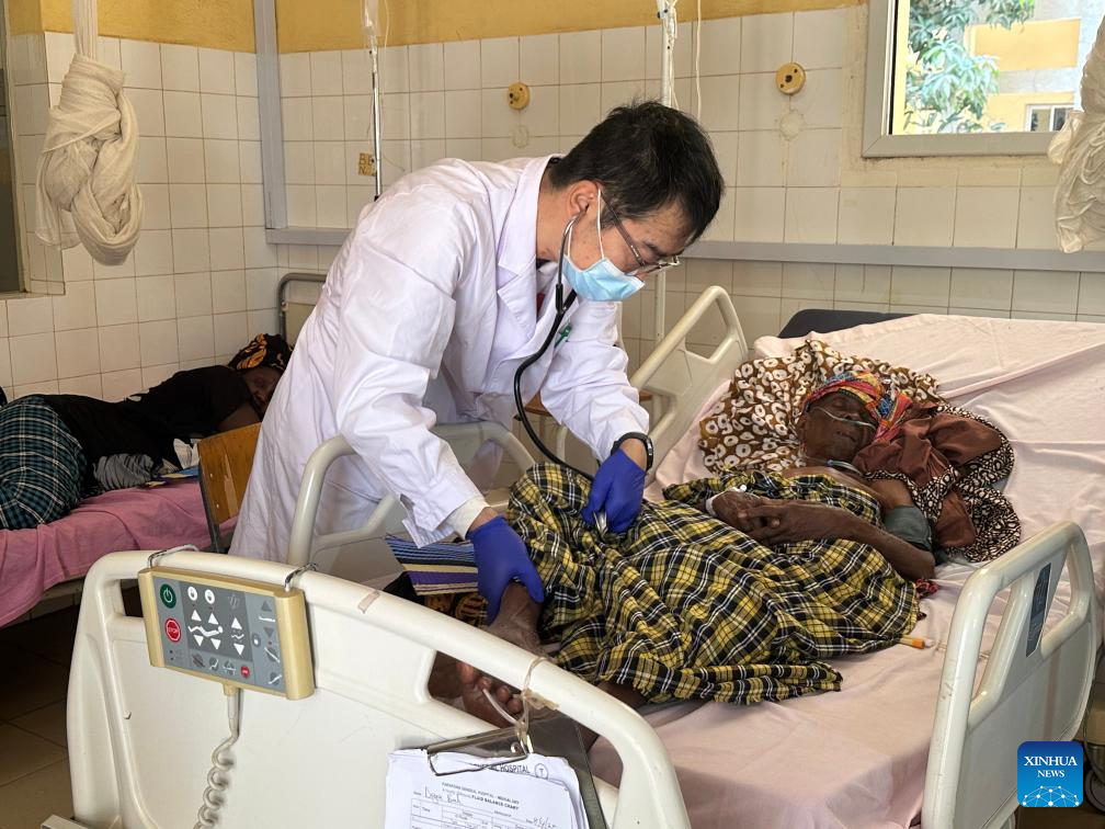 A member of the 22nd batch of the Chinese medical team in The Gambia examines a patient at the Farafenni General Hospital in the North Bank Division, The Gambia, April 8, 2025. The 22nd batch of the Chinese medical team in The Gambia conducted an outreach clinic and medical supplies donation event at the Farafenni General Hospital in the North Bank Division on Friday.